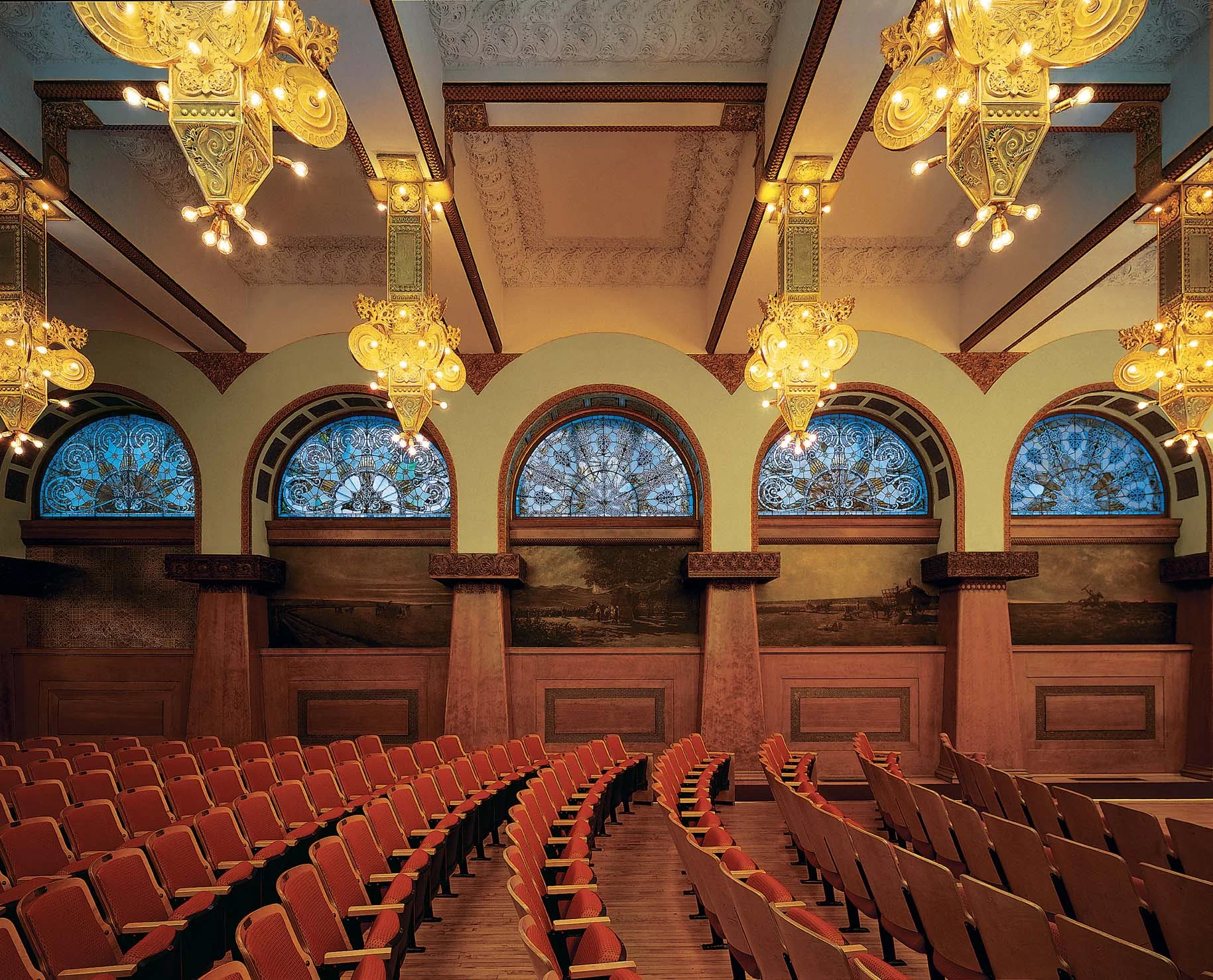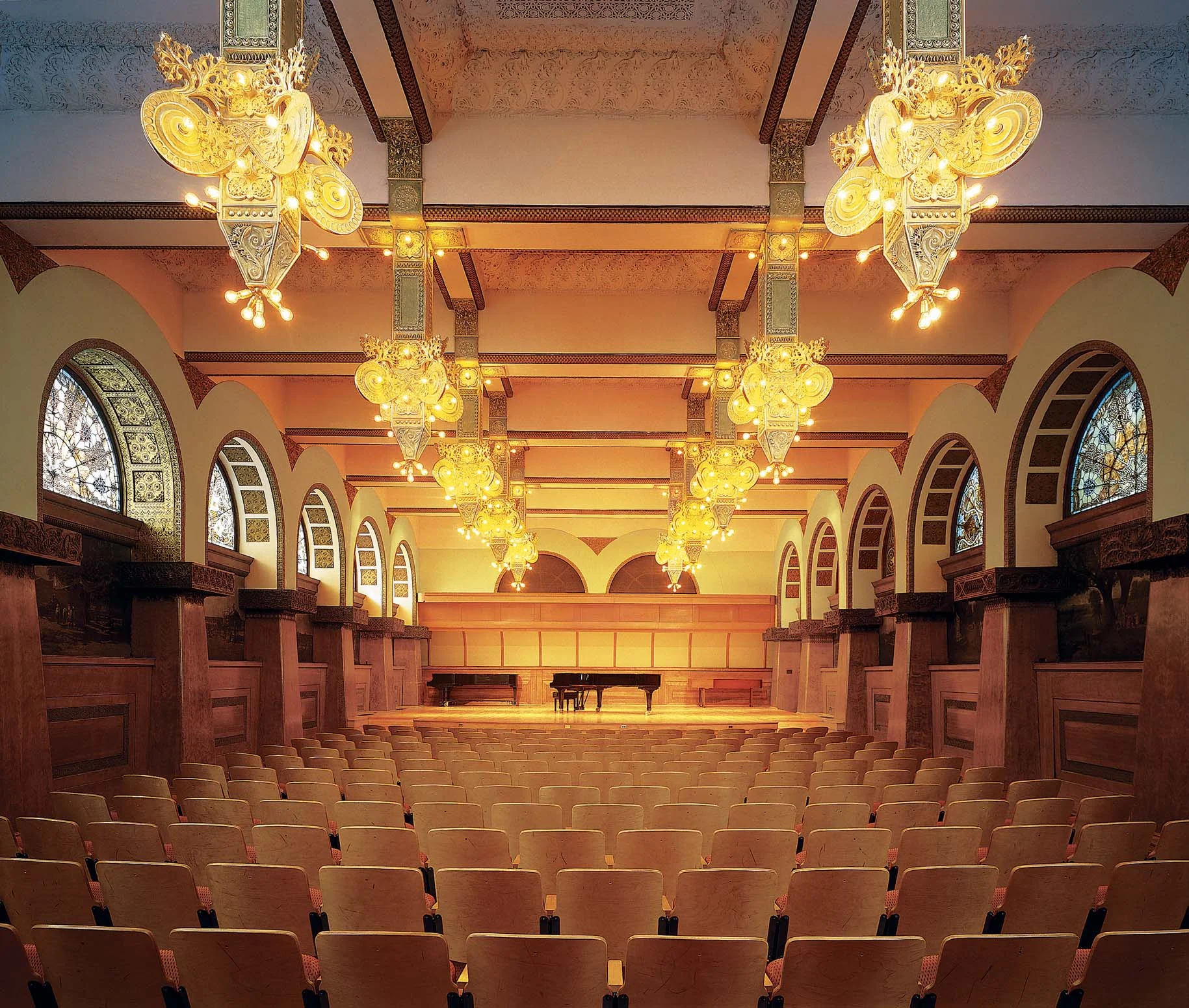 Ganz Hall is a National Historic Landmark designed by Louis Sullivan in 1890. Originally designed as a banquet hall, with elaborate details including cast plaster, carved wood ornaments, stained glass windows, and cast iron electric chandeliers, the hall had fallen into major disrepair. Rotholz was hired by Roosevelt’s VP for Finance and Administration to lead the project. The project design team recreated new chandeliers from archival photographs. Each chandelier was clad in gold leaf and hand painted. Structural modifications were necessary to support the 450 pound individual fixture weight. The ornate carved wood panels were restored, and a new mechanical system was installed to control environmental conditions. The project received a Chicago Landmark Award for Preservation Excellence.